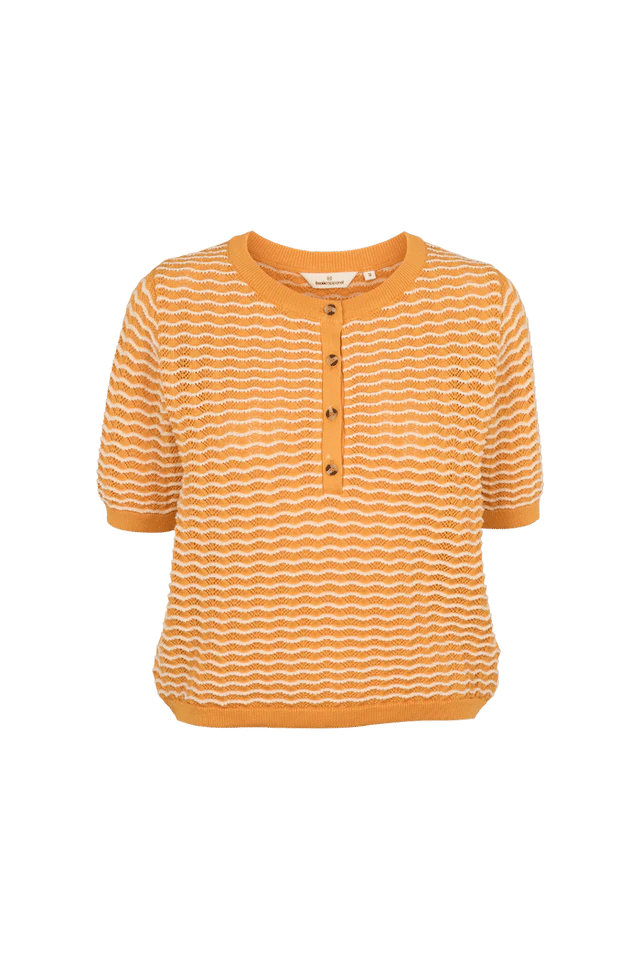 Dieser W's Cashi Granddad Pullover vereint Einfachheit und Komfort für einen lässigen Alltag. Entworfen aus leichtem Mesh mit kurzen Ärmeln, passt sich dieses orange T-Shirt sowohl an Sommertage als auch an leichtere Schichten in der kühlen Jahreszeit an. Das atmungsaktive Gewebe sorgt für ein Gefühl von Frische und bietet gleichzeitig eine optimale Weichheit gegenüber der Haut. Die klassische Passform, ergänzt durch einen gerippten Kragen und drei dezente Knöpfe, verstärkt seine zeitlose und vielseitige Seite. Perfekt für Momente der Entspannung, Freizeit oder auch ein lässiges Outfit bei der Arbeit, passt diese Basis einfach in jeden Anlass. -