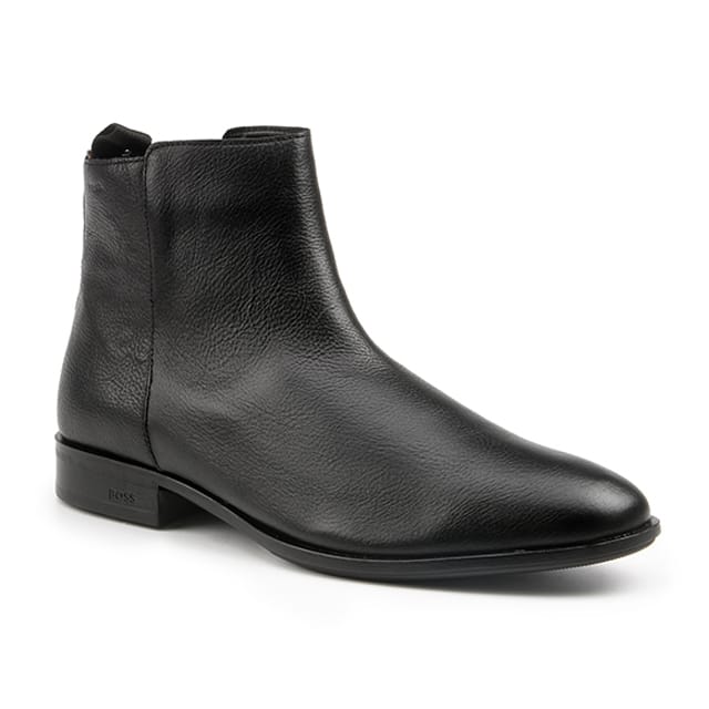 Die Ankle Boots Colby Boot der Marke BOSS sind für den stylischen Alltag konzipiert. Diese schwarzen Stiefel aus Leder zeichnen sich durch ein glattes Finish und eine dezente Textur aus. Ihr Design umfasst eine niedrige Ferse von etwa einem Zoll in schwarzem Material, bietet einen schlanken Look. Ein kleiner Verschlussknopf auf der Rückseite sorgt für eine bequeme Passform. Ohne sichtbare Schnürsenkel oder Schnallen deuten diese Stiefel auf die Existenz eines elastischen Paneels (nicht sichtbar) hin, um die Anpassung zu erleichtern. Die Gummisohle zeichnet sich durch ein minimales Aufgabenmuster aus, was auf eine ideale Passform für urbane Umgebungen anstelle von rauem Gelände hinweist. Die Aufschrift "BOSS" ist in der Nähe des Fersenbereichs auf der Außenseite des Stiefels eingraviert. Details dieser Stiefel sind ein warmes Textilfutter für Komfort, eine abnehmbare Memory-Schaum-Innensohle für eine individuelle Passform und eine Gummiaußensohle für soliden Schutz. Diese Stadt Stiefeletten sind ideal für Ausflüge, Arbeit oder den täglichen Gebrauch und bieten eine perfekte Mischung aus Komfort, Stil und Schutz. -