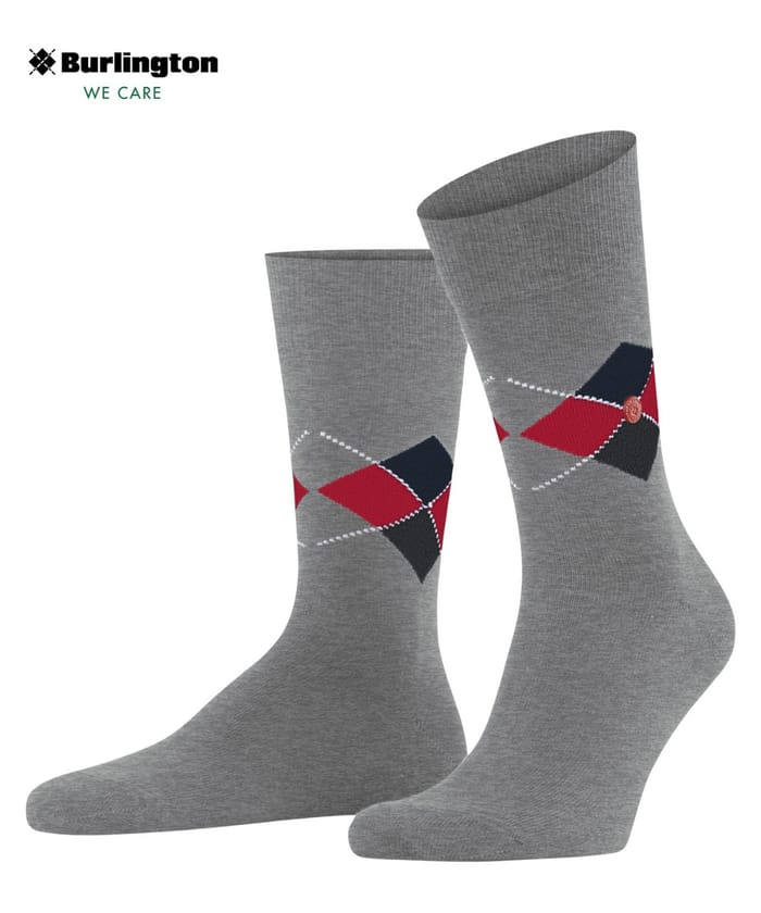 Entdecken Sie die MULTI KING City Socken von Burlington M, perfekt für Ihren Alltag, Ihre Abende oder Ihr Büro. Diese eleganten grauen Socken zeichnen sich durch ein Diamantmuster mit roten, navyblauen und weißen Akzenten aus. Das Burlington-Markenlogo "WE CARE" wird in der oberen linken Ecke angezeigt, während auf einem der Diamanten in der Nähe des Knöchels ein kleines rundes Logo erscheint. Hergestellt aus 70% Bio-Baumwolle und 30% Polyamid, bieten diese Socken außergewöhnlichen Komfort und Atmungsaktivität. Ihre Finesse und Eleganz machen sie zu einer idealen Wahl für formelle oder informelle Anlässe. -