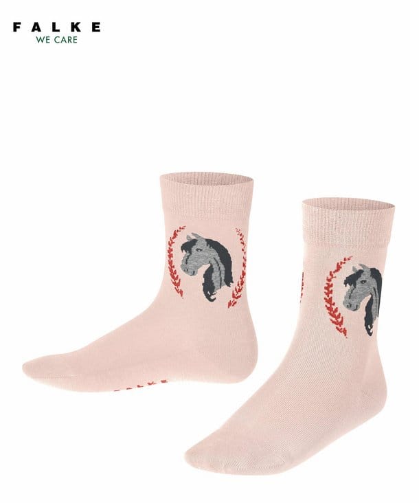 Entdecken Sie die K's HORSE City Socken der Marke Falke, perfekt für klassische und elegante Anlässe. Diese Socken bestehen aus 82% Baumwolle, 15% Polyamid, 2% Elasthan und 1% Metallic Polyamid und bieten außergewöhnlichen Komfort und Atmungsaktivität. Ihre Finesse und Weichheit machen sie ideal für den täglichen Gebrauch, Abende oder das Büro. Die Socke ist mit einem hübschen Design eines grauen Pferdes umgeben von roten Lorbeerblättern geschmückt, während das Logo "FALKE" und der Slogan "WE CARE" in schwarzen Buchstaben in der oberen linken Ecke des Bildes gedruckt sind. Die rosa Farbe dieser Socken ist eine elegante Note, die sie perfekt für formelle Anlässe macht. -