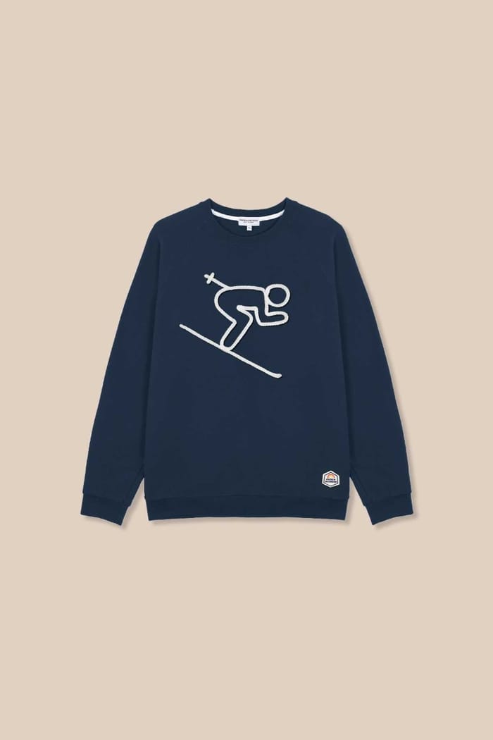 Das M's SKIEUR der Marke French disorder ist ein rundhalsiges Sweatshirt für Komfort und Casual Style. Hergestellt aus 100% Bio-Baumwolle, bietet es natürliche Weichheit und progressive Wärme, ideal für Momente der Entspannung oder tägliche Ausflüge. Seine marineblaue Farbe verbindet sich mit einer eleganten Grafik auf der Vorderseite: ein Skifahrer in Bewegung, vertreten mit zwei Skiern und dynamischen Features, die den Schwung der Geste einfangen. Der Hintergrund des Designs ist eine leichte beige Ton, Hervorhebung des Musters. Ein kleines Patch-Logo ist dezent in der Nähe des rechten unteren Saumes platziert. Dieses Sweatshirt ist Teil eines gemütlichen und vielseitigen Sortiments, perfekt für Freizeit oder Alltag. -
