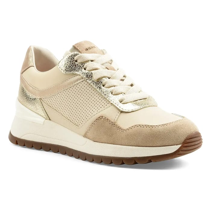 Der Geox D DESYA vereint Eleganz und Komfort in einer zeitlosen Silhouette. Entworfen, um auf einer täglichen Basis getragen werden, bieten diese Leder-und Wildleder Sneaker trendigen Stil und optimale Vielseitigkeit für Freizeit oder einen Ausflug in der Stadt. Das Leder- und Wildleder-Top, kombiniert mit ähnlichen Materialdetails rund um Zehe und Ferse, bringt einen stilvollen Touch. Die cremefarbene Gummiaußensohle sorgt für diskrete Haltbarkeit, während das Textilfutter und die abnehmbare Innensohle den ganzen Tag über zu optimalem Komfort beitragen. Die atmungsaktive Sohle, emblematisch von Geox, sorgt für eine gute Innenraumlüftung für sofortiges Wohlbefinden. Ein elegantes Design mit beigen Schnürsenkeln und einer ikonischen diskreten Geox-Signatur in der Nähe des Kragens rundet dieses Modell ab, das modernen Komfort verkörpert. -