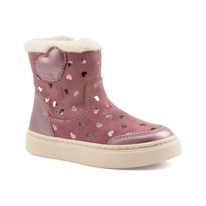 Die warmen Nashik Stiefel von Geox sind auf Komfort und Vielseitigkeit ausgelegt. Sie verfügen über ein Oberteil aus Samtleder und ein synthetisches Obermaterial, während das Futter aus warmem Textil besteht. Die Innensohle ist auch aus warmem und abnehmbarem Textil gefertigt. Die Laufsohle ist aus Gummi. Details des Stiefels sind ein Samt Leder erste Schritte Stiefel, mit metallischen Herzen berührt und ein weißes Kunstfell Futter. Ein Herzpatch befindet sich auf der Seite, in der Nähe der Oberseite, mit dem bestickten "GEOX" Logo oben. Die Nashik Stiefel sind in rosa erhältlich und in einem lässigen Stil gestaltet, geeignet für Kinder oder junge Mädchen. Sie bieten Unterstützung, Komfort und Langlebigkeit, so dass sie eine ideale Wahl für den allgemeinen und täglichen Gebrauch.