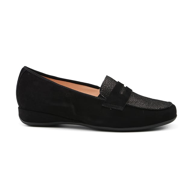 Petra G von Hassia, ein klassischer Loafer, der Raffinesse und Komfort verbindet. Seine Samt Wildleder Tops und Stiele bieten eine reiche und elegante Textur, während sein Lederfutter bringt einen Hauch von Luxus. Der 25 mm Keilabsatz garantiert eine stabile und komfortable Position. Die abnehmbare Ledersohle macht es einfach, sich anzupassen und zu pflegen. Die Gummisohle sorgt für Haltbarkeit und Verschleißfestigkeit. Das Slip-on-Design, mit elastischem Einsatz, ermöglicht eine einfache Einstellung und einfache Ausgabe. Die schwarze Farbe ist ideal für formale oder halbformale Anlässe, wie Abende, Veranstaltungen oder das Büro. Die Petra G von Hassia ist eine perfekte Wahl für diejenigen, die Stil, Komfort und Raffinesse zu schätzen wissen. -