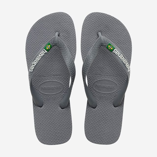 Die Havaianas Brasil Logo sind leichte, atmungsaktive Strandsandalen für die Sommerentspannung. Diese Flip-Flop Sandalen sind aus synthetischen Materialien für die Innensohle, Sohle und barfuß Details hergestellt. Ihre graue Farbe ist ideal für den Sommer. Die Träger sind mit dem Logo "Havaianas" in weißen Buchstaben sowie einer kleinen brasilianischen Flagge an jedem Ende des Stammes geschmückt. Die Sohlen tragen ein geprägtes ovales Logo, das den Namen "Havaianas" trägt, während der untere Teil des linken Flip-Flops die Größe oder das Modell angibt. Diese Sandalen sind ideal für Strände, Sommertage oder einfach nur zum Entspannen. -