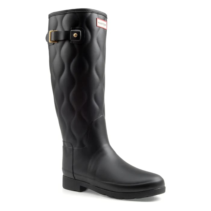 Der TALL BOOT Regenschuh von Hunter boot vereint Stil und Funktionalität in einem ikonischen Design. Aus strapazierfähigem Gummi gefertigt, bietet es absolute Wasserdichtigkeit, ideal für den Regen mit Eleganz. Sein fünfzehn Diamanten gemustertes Design bringt eine unverwechselbare Note, während das textile Innenfutter für optimalen Komfort den ganzen Tag sorgt. Die texturierte Gummisohle sorgt für erhöhte Stabilität und der 25 mm Absatz sorgt für dezente Stabilität, ohne auf Komfort zu verzichten. Ein verstellbarer Gurt mit Goldverschluss ermöglicht die perfekte Anpassung des Halts um den Knöchel. Erhältlich in schwarz, passt dieser Stiefel in die funktionalen, lässigen und modischen Sortimente, sowohl für tägliche Ausflüge als auch für Outdoor-Aktivitäten geeignet. Sein rechteckiges rotes Etikett mit dem Text "HUNTER" in Weiß bestätigt seinen Premium-Ursprung. -