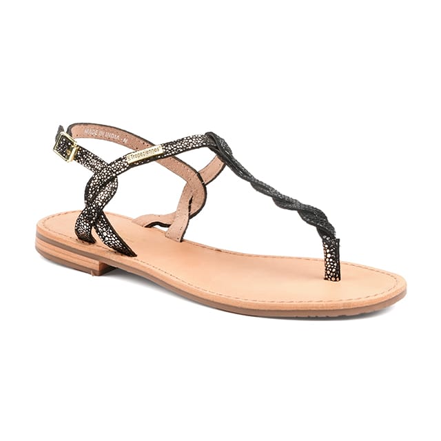 Entdecken Sie die HAMSONG, flache Sandalen im lässigen und sommerlichen Stil, entworfen von Les Tropeziennes. Dieses Paar schwarze Sandalen aus Metallicleder, mit Lederfutter, verfügt über eine Lederinnensohle und eine synthetische Außensohle für optimale Leichtigkeit und Komfort. Die Sandale ist mit einem metallisierten Lederoberteil ausgestattet, verziert mit einem Gold-Metallverschluss, der den Schultergurt schließt, sowie einem metallisierten Lederschultergurt mit einem Flechtmuster. Die HAMSONG sind ideal für Ferien, Strände oder Sommertage. -