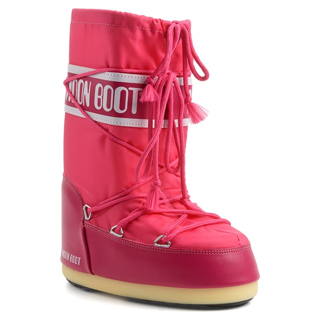 Die Moon Boot NYLON Schneestiefel sind für Outdoor-Aktivitäten im Winter konzipiert. Diese funktionellen und robusten Stiefel verfügen über eine Gummisohle und eine synthetische Schaumstoff-Innensohle für eine optimale Wärmedämmung. Das synthetische Schaumstofffutter sorgt für Wärme und Komfort bei langen Schneewanderungen. Das textile und synthetische Obermaterial ist wasserdicht und wetterfest. Die verstellbaren Träger mit silbernen Ösen garantieren eine präzise Passform. Die Moon Boot NYLON Stiefel sind in einer hellen Fuchsia Farbe erhältlich. -