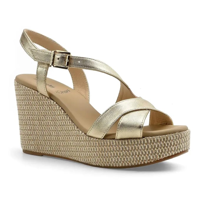 Die Malfa Keilsandalen der Marke Nero Giardini verbinden zeitlose Eleganz mit italienischer Kühnheit. Entworfen in einem glänzenden Metallic-Leder mit goldenen Highlights, erfassen sie den raffinierten Geist von *Made in Italy*, wo jedes Detail die Silhouette sublimieren soll. Die 90 mm hohe Gummisohle bietet perfekte Stabilität für Abende oder Ausflüge, während das Lederfutter und die Innensohle für optimalen Komfort sorgen, auch nach langen Stunden getragen. Das elegante Design, geprägt von eleganten Trägern, unterstreicht die Finesse der handwerklichen Arbeit. Die goldfarbene, helle und raffinierte Farbe passt zu den abwechslungsreichsten Outfits, ob lässig oder leicht gekleidet. Nero Giardini, gleichbedeutend mit Exzellenz und Innovation, kennzeichnet hier ein Stück, das Stil und Komfort verkörpert, für diejenigen, die das Außergewöhnliche im Alltag suchen. -