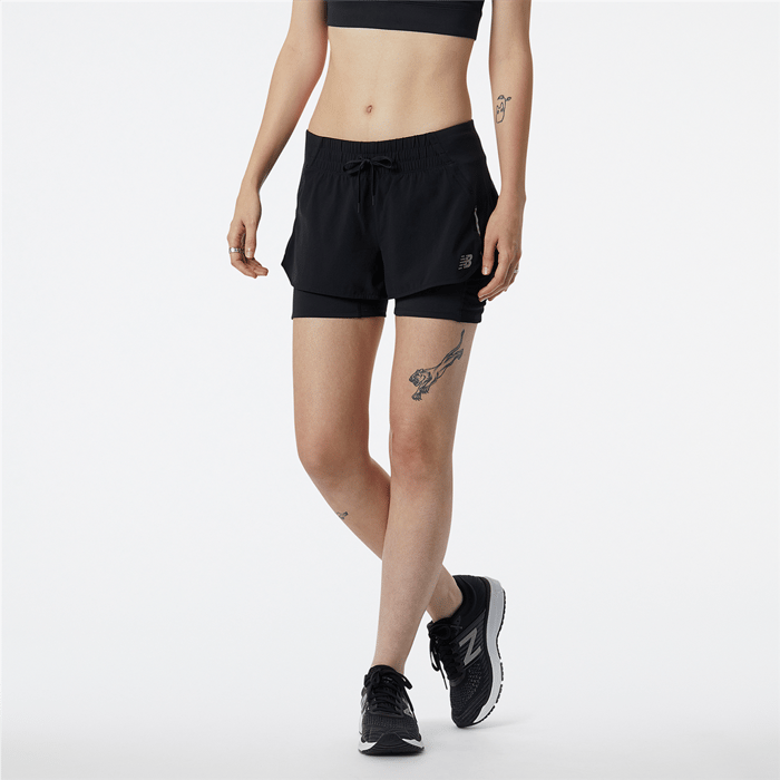 Beliebte 2 in 1 Lauf-Shorts mit enganliegender Innenshorts und leichter Aussenshorts aus Stretch-Material. Atmungsaktiv und schnelltrocknend. Im Rückenbereich sorgt eine verschliessbare und eine offene Tasche für verschiedene Stauraum-Möglichkeiten. Zudem hat die Hose eine Drop-In Taschen auf der Innenshorts. -