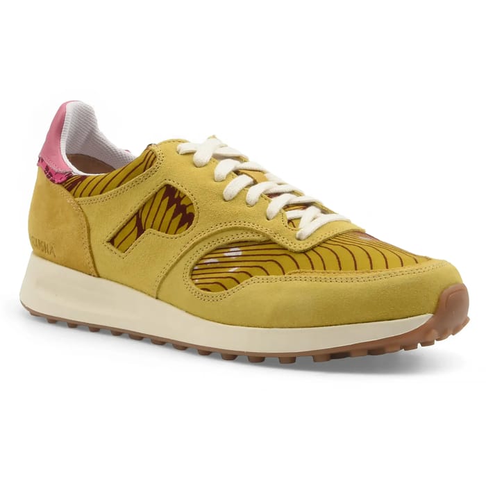 Die Arusha Sneakers der Marke Panafrica vereinen Eleganz und Langlebigkeit für einen zeitlosen urbanen Stil. Entworfen aus Samtleder und recycelter Baumwolle, kombinieren sie Weichheit und Widerstandsfähigkeit, während sie Teil eines ökologischen Ansatzes sind. Ihr Textilfutter sorgt für optimalen Komfort, während die abnehmbare und textile Innensohle eine perfekte Anpassung an die Morphologie des Fußes ermöglicht. Die Gummisohle bietet erhöhte Stabilität für flüssige Schritte, ob täglich, für einen Spaziergang oder während der Freizeitaktivitäten. Das kühne Design dieser Sneakers verfügt über eine mehrfarbige Palette mit lebendigem Senf gelb, weiße Schnürsenkel und braune Seitenstreifen, die die Silhouette energetisieren. Ein pinkes Detail am Fersenkragen und die in der Nähe des Vorderfußes eingravierte Inschrift "RUSHA" verleihen einen Hauch Originalität. Perfekt für den vielseitigen Einsatz geeignet, verkörpern diese Sneaker die ideale Kombination aus Mode und Komfort, für einen trendigen Look, der sich jedem Anlass anpasst. -