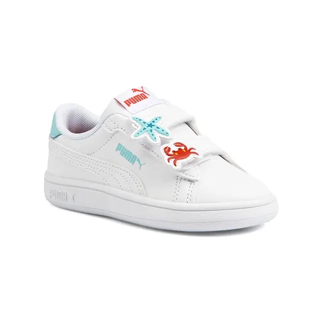 Die Puma Smash sind Klett-Sneaker für den täglichen Gebrauch. Diese praktischen und lässigen Schuhe sind ideal für Freizeitaktivitäten und leichte Mobilität. Ihr Oberteil und Stiel sind aus Synthetik, während das Futter aus Textil besteht. Die Innensohle ist auch textil und abnehmbar. Die Sohle ist aus Gummi. Ihr Sneaker ist synthetisch, was zu ihrer Vielseitigkeit beiträgt. Die Puma Smash sind in weiß erhältlich, eine helle Farbe, die ihrem nüchternen Design entspricht. Das PUMA Logo ist auf dem Schuh bedruckt, sowohl in der Nähe der Ferse als auch auf der Zunge. Dekorative Elemente wie ein blauer Seestern und eine rote Krabbe verleihen diesen Schuhen einen Hauch von Persönlichkeit. -