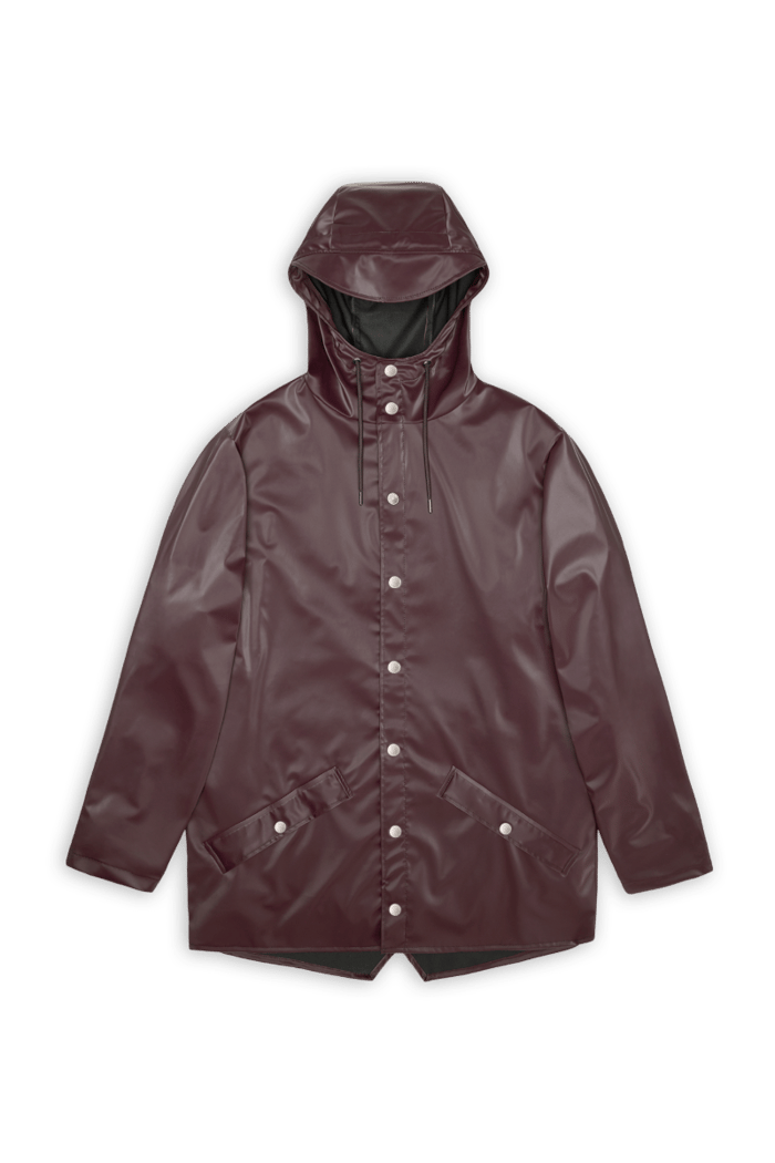 Jacke Regenjacke Rains Jacke W3, wasserdichter Stil, aus 100% Polyester mit Polyurethan-Beschichtung. Diese vielseitige Jacke ist ideal für Outdoor-Aktivitäten, Stadtausflüge und Regentage. Es verfügt über ein funktionales Design mit einem weißen Knopfverschluss entlang der Vorderseite und Knopftaschen an den Seitentaschen. Die langen Ärmel und die verstellbare Kappe mit Seil sorgen für optimalen Schutz vor Regen. Die burgunderfarbene Farbe verleiht dieser vielseitigen Regenjacke einen Hauch von Stil. -
