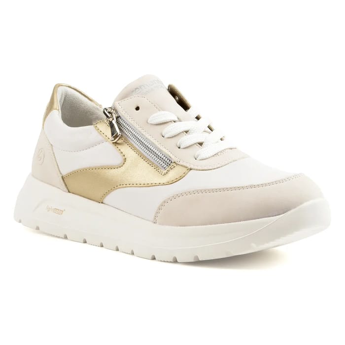 Der D2V02-80 der Marke Remonte ist ein trendiger und eleganter Schuh, ideal für den Alltag. Entworfen in Premium-synthetik, dieser beige Sneaker verfügt über eine moderne Ästhetik mit goldenen Akzenten auf der Seite und fügt einen Hauch von Raffinesse. Ein dezenter Reißverschluss in der Nähe der Ferse macht es einfach, auf rutschen, während schlanke flache Schnürsenkel und Nähte verbessern seine strukturierte Design. Die herausnehmbare textile Innensohle sorgt für optimalen Komfort, und die dicke synthetische Außensohle mit der Aufschrift "lightsole" bietet gute Stabilität und Dämpfung. Mit einem 35 mm Absatz kombiniert er Leichtigkeit und Stabilität für einen angenehmen Spaziergang. Der Markenname ist auf der Rückseite des Kragens eingraviert, während das gesamte Modell an zeitgenössischen Stil und Vielseitigkeit erinnert. Perfekt für Freizeit oder einen Ausflug in die Stadt, ist dieser Sneaker in der Tradition der aktuellen Mode. -