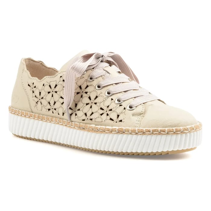 Die Rieker M2902-60 Sneaker verbinden trendigen Style mit Alltagskomfort. Entworfen in einem eleganten Synthetik, passen sie in die Mode mit einer schlanken und modernen Ästhetik. Das synthetische Oberteil verfügt über gepflegte Nähte Details, die die Haltbarkeit verbessern und gleichzeitig einen Hauch von Raffinesse. Die abnehmbare Lederaußensohle sorgt für optimalen Komfort, während die synthetische Außensohle natürlich den Fuß für einen leichten und flexiblen Spaziergang umarmt. Der 25 mm Absatz bietet diskrete Stabilität, ideal für den Alltag oder für die Freizeit. Das elegante beige Design, verstärkt durch pastellrosa Schnürsenkel, die durch Silberarbeiten gehen, paart sich wunderschön mit einer geflochtenen Burlape oben um die Kontur der Sohle, die einen zeitgenössischen Espadrille-Look hervorruft. Diese Sneaker zeichnen sich als vielseitiger Verbündeter für alle Alltagsoutfits aus und verbinden Leichtigkeit, Flexibilität und Komfort ohne Kompromisse. -
