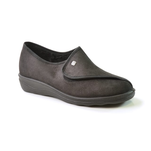 Textilhausschuh mit Keilabsatz mit Klettverschluss