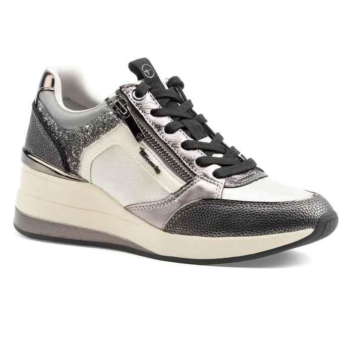 Low Sneakers Tamaris 23703: ein Paar Keilabsatz Sneakers, die Eleganz und Komfort vereinen. Top und Obermaterial bestehen aus Leder und Synthetik, während das Futter aus Textil besteht. Die Innensohle ist auch textil und abnehmbar. Die Sohle ist aus Kunststoff gefertigt und bietet eine Höhe von 60 mm. Zu den Details des Paares gehören ein Leder- und ein synthetischer Sneaker. Die Farbe ist bunt, mit Grau-, Weiß- und Silbertönen. Dieses Paar Sneakers ist ideal für Ausflüge, Freizeit- und Alltagsaktivitäten. Es bietet schicken Stil und großen Komfort, so dass es eine Wahl unter den besten weiblichen Mode-Optionen. -