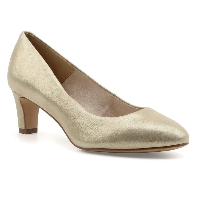 Diese Daenerys Pumpen der Marke Tamaris verbinden zeitlose Eleganz mit eleganter Raffinesse, um jeden Anlass zu bereichern. Entworfen in hochwertigem Leder, bieten sie eine weiche Note und dauerhafte Beständigkeit, perfekt für den täglichen Gebrauch oder formalere Momente. Ihr synthetisches Textilfutter sorgt für optimalen Komfort, während die Lederinnensohle und die synthetische Außensohle Stabilität und Komfort bei jedem Schritt erhöhen. Mit einem 60 mm Absatz kombinieren diese Pumpen elegante Höhe und bequemen Verschleiß, ideal für Büro, Partys oder besondere Anlässe. Ihr Gold-Metallic-Finish bringt einen Hauch von Glamour und Modernität, während ihr elegantes Design und ihre scharfe Passform sie zu einem Must-Have für Frauen machen, die nach Stil und Unterscheidung suchen. Tamaris, gleichbedeutend mit smarter Auswahl und femininem Komfort, kennzeichnet hier ein Stück, das seine Positionierung perfekt verkörpert: chic, elegant und entschlossen trendy. -