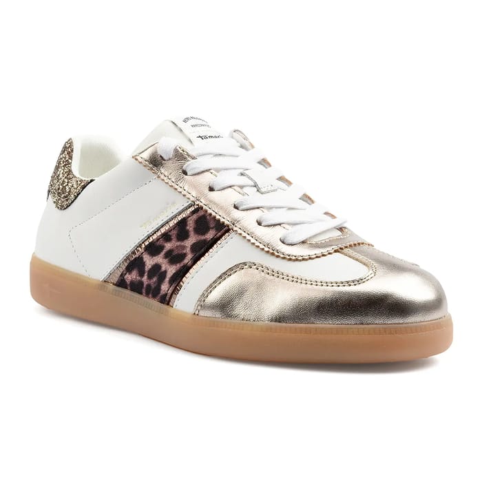 Die Low Sneakers Tamaris Leo sind ein Must-Have für Fashion-Liebhaber. Diese trendigen und femininen Schuhe verbinden Eleganz und Komfort zu einem einzigartigen Trageerlebnis. Ihr Oberteil besteht aus glänzendem weißem Leder und metallischem Synthetikstoff, mit einem Streifen aus schwarzen Pantherstreifen, der ihrem Design eine kühne Note verleiht. Die weißen Schnürsenkel durchziehen silberne Ringe, während die hintere Lasche mit glitzerndem Material verziert ist. Die Gummisohlen widerstehen gut und bieten einen guten Halt. Die Low Sneakers Tamaris Leo eignen sich ideal für Spaziergänge, Freizeitausflüge oder einfach nur um Ihre Alltagsoutfits zu begleiten. Mit ihrem vielseitigen Stil und garantiertem Komfort sind sie eine unverzichtbare Wahl für Frauen, die modisch bleiben möchten, während sie bequem bleiben. -