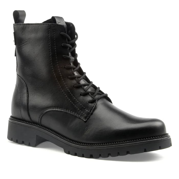 Entdecken Sie die Tamaris Soul Stiefeletten für freigeistige Abenteurer. Diese schwarzen Lederstiefel mit Schnürsenkel und Reißverschluss sind ideal für Motorradtouren oder Wandertage. Der 30mm Absatz bietet soliden Schutz, während das warme Textilfutter und die synthetische Außensohle für optimalen Komfort sorgen. Die sichtbaren Nähte Details verleihen diesen robusten Stiefeletten einen Hauch von Eleganz. Die Tamaris Soul Stiefel sind perfekt für kalte Tage und Outdoor Ausflüge. -