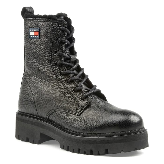 Tommy Hilfiger TJW URBAN LACEUP BOOT WL vereint Stil und Langlebigkeit für optimalen Komfort. Entworfen aus dickem, robustem Leder, ist dieser Biker Stiefel ideal für alltägliche Aktivitäten und Motorradfahrten geeignet. Das Lederoberteil mit warmem Stofffutter sorgt für bemerkenswerten Komfort, während die Stoffinnensohle und die Gummiaußensohle für eine hervorragende Unterstützung und eine gute Passform am Fuß sorgen. Mit einem 45 mm Absatz bietet er eine perfekte Balance zwischen Eleganz und Stabilität. Mit einem funktionalen Design ist dieser Stiefel ideal für urbane Routen oder Ausflüge in die kühle Jahreszeit. Sein zeitloses Erscheinungsbild und lässiger Chic-Stil machen es zu einem Must-Have im lässigen und robusten Sortiment. Der Stiefelettenschuh verfügt über ein Tommy Jeans Logo Detail in blau mit weißen Buchstaben und roten und weißen Streifen auf der Seite. Es hat eine schleifenförmige Spitze auf der Rückseite und Metallösen für eine individuelle Passform. Die schwarze Farbe unterstreicht ihr elegantes und modernes Erscheinungsbild. -