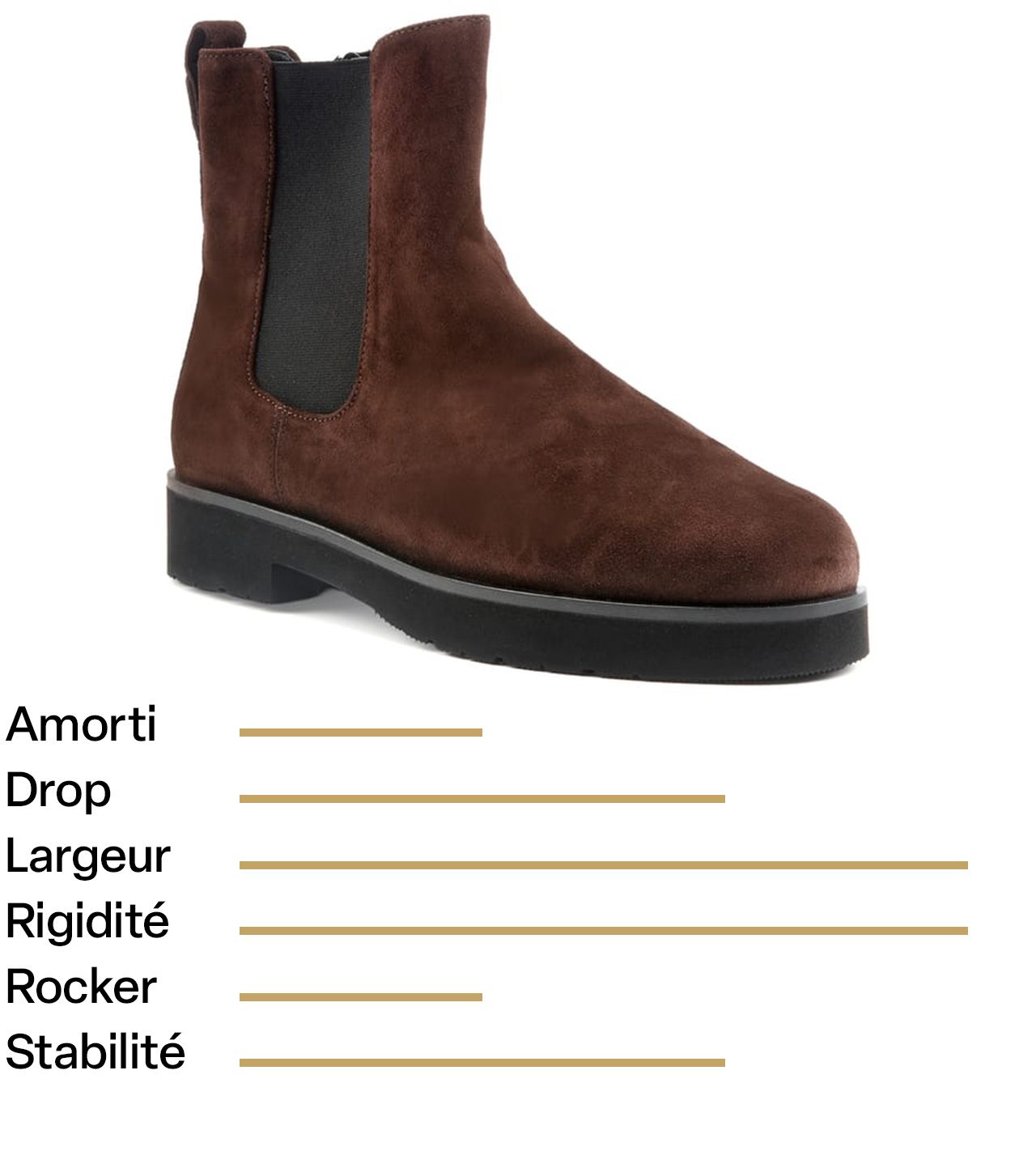 Ces bottines ont été sélectionnées pour leur tige en cuir velours souple, leur semelle extérieure en gomme très confortable, leur semelle intérieure amovible et leur très bonne rigidité sur l’avant-pied.