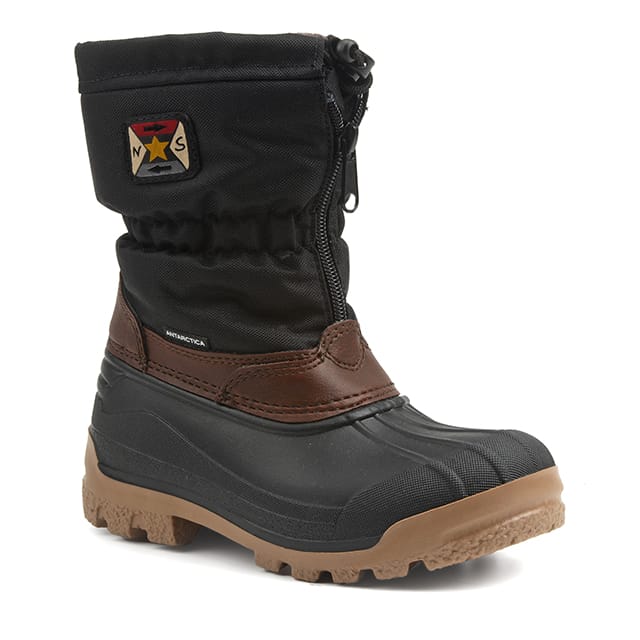 Les bottes de neige Antarctica 1 sont conçues pour les activités extérieures hivernales. Elles disposent d'un dessus et d'une tige en textile et caoutchouc, offrant une combinaison de flexibilité et de résistance. La doublure textile chauffante garantit un confort optimal dans les conditions froides. La semelle intérieure textile chauffante apporte une chaleur supplémentaire. La semelle en gomme assure une protection contre la neige et la pluie. Les bottes sont imperméables et conçues pour résister aux intempéries. Leur design haut de la jambe offre une protection supplémentaire contre les éléments. La fermeture éclair en toile permet un accès facile et rapide. La couleur noire est associée à une gamme de produits fonctionnels et robustes. Le logo de la marque est visible près du haut, entouré d'un écusson qui inclut une étoile. Le texte "MONTANA" est imprimé au-dessus du nom de la marque. -