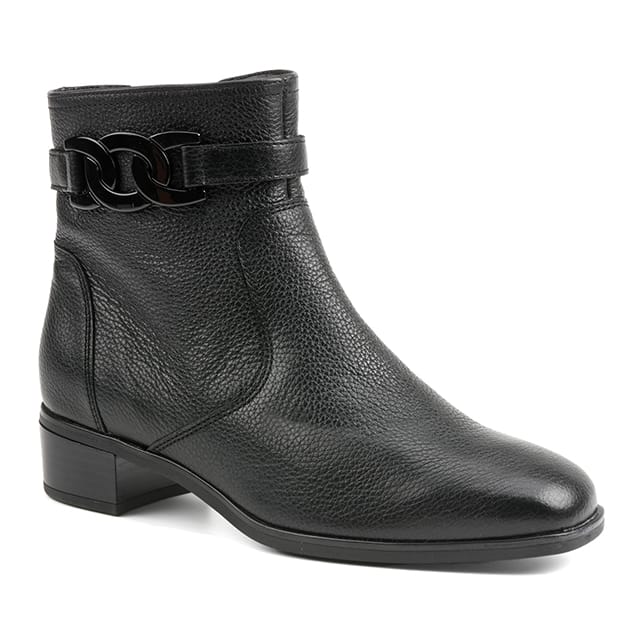 Découvrez les bottines GRAZ-ST de la marque Ara, conçues pour offrir un confort de marche optimal tout en étant robustes et pratiques. Ces bottines en cuir noir, avec talon de 35 mm, sont idéales pour les activités extérieures, le travail ou les sorties automnales et hivernales. Leur semelle en gomme garantit une protection solide, tandis que la doublure textile chaud assure un confort supplémentaire. La semelle intérieure textile et amovible facilite la maintenance et le remplacement. Les détails de la conception, tels que la texture du cuir et les chaînes de fer en forme de chaînes autour du talon, ajoutent un élément de style robuste et décontracté à ces bottines. Les bottines GRAZ-ST de la marque Ara sont conçues pour satisfaire les besoins des individus qui recherchent un mélange de confort, de protection et de style pour leurs sorties. -