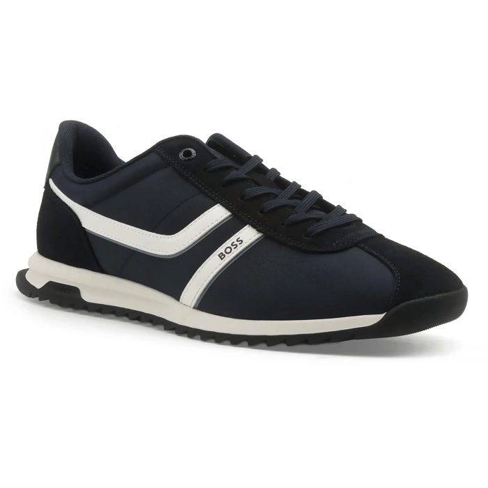 Ces sneakers Zayn_Lowp_nymi de la marque BOSS allient élégance intemporelle et polyvalence pour s’adapter à toutes les occasions. Conçues dans un style classique, elles se distinguent par leur tige synthétique, à la fois légère et résistante, idéale pour un usage quotidien, que ce soit au bureau ou pour des sorties plus décontractées. Leur doublure textile assure un confort optimal, tandis que la semelle intérieure amovible en textile permet un ajustement personnalisé selon vos préférences. Le design sobre et raffiné, marqué par une bande latérale blanche et le logo BOSS en lettres noires, confère à ces chaussures une touche sophistiquée. La couleur bleu marine, profonde et intemporelle, renforce leur caractère polyvalent, s’harmonisant aussi bien avec des tenues formelles qu’avec des looks plus décontractés. La semelle en gomme, conçue pour une durabilité accrue, garantit une bonne stabilité à chaque pas, tout en préservant l’esthétique soignée du modèle. Parfaites pour ceux qui recherchent un équilibre entre style et confort, ces sneakers BOSS incarnent l’essence d’une garde-robe minimaliste et intemporelle. -