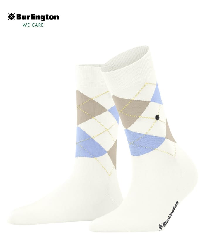Les chaussettes W's COVENT GARDEN SO de la marque Burlington sont des accessoires de ville élégants et classiques. Ces chaussettes de ville sont confectionnées à partir de 84% de coton organique et de 16% de polyamide, offrant un confort et une respirabilité exceptionnels. Leur design est caractérisé par un motif de carreaux blanc cassé avec des formes géométriques en forme de diamants en bleu clair, beige et blanc, entourés d'une fine ligne pointillée jaune. Un petit bouton noir est présent près de la partie molletière d'une chaussette. Les chaussettes portent le logo de la marque Burlington, ainsi que leur slogan "WE CARE", à l'angle supérieur gauche de l'image. Le logo est également imprimé à la partie talonnière de chaque chaussette. Ces chaussettes sont idéales pour les occasions quotidiennes, les soirées ou les réunions professionnelles. -