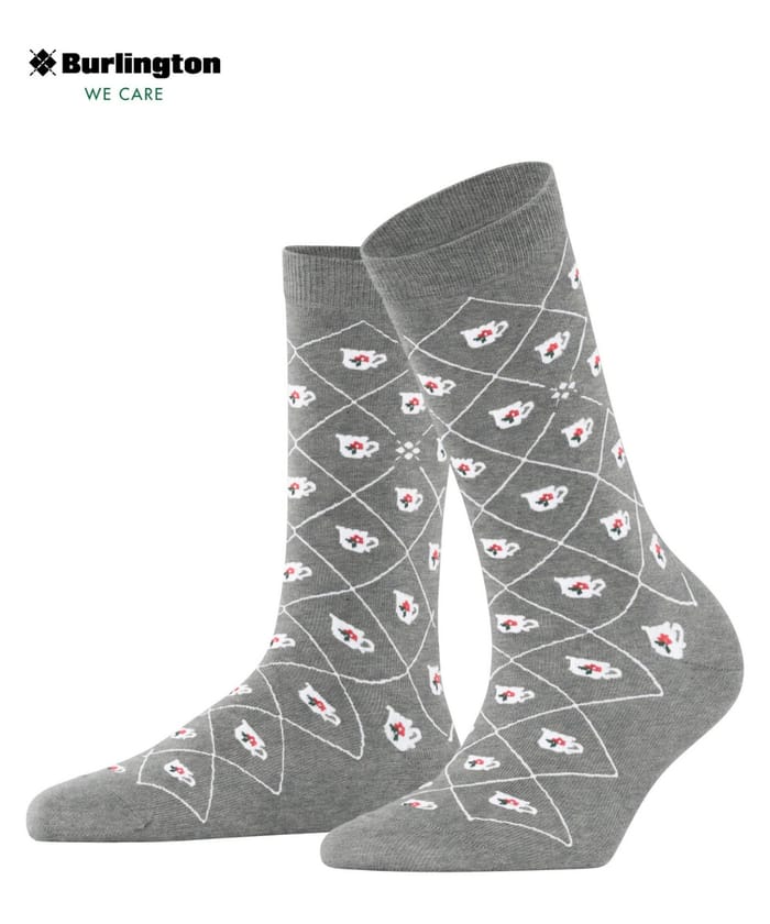 Les chaussettes W's Teatime de la marque Burlington sont des chaussettes de ville élégantes et classiques. Confectionnées à partir de 83% de coton biologique, 15% de polyamide et 2% d'élasthanne, elles offrent un confort optimal tout en étant respirantes et fines. Leur design argyle, composé de motifs de théières blanches et de fleurs rouges sur fond gris, les rend parfaits pour une tenue quotidienne ou pour une soirée. Les chaussettes W's Teatime sont idéales pour un usage bureau, quotidien ou pour une occasion spéciale. Le logo de la marque Burlington et le slogan "WE CARE" sont visibles dans le coin supérieur gauche, ajoutant un touch de personnalité à ces chaussettes élégantes. -