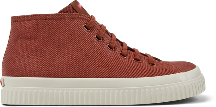 Baskets pour homme en coton recyclé rouge avec une semelle intérieure OrthoLite® Recycled™ et une semelle extérieure en caoutchouc. La Peu Roda doit son nom au terme majorquin employé pour désigner une « roue », qui a inspiré la texture de sa semelle extérieure en caoutchouc vulcanisé.