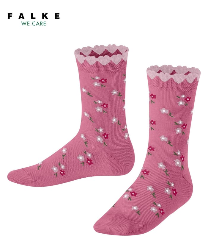 Les chaussettes K's Ditsy Flowers de la marque Falke allient élégance et confort au quotidien. Confectionnées à partir d’un mélange de 74 % coton, 24 % polyamide et 2 % élasthanne, elles offrent une finesse remarquable ainsi une respirabilité optimale. Ces chaussettes de ville s’inscrivent dans une gamme classique et élégant, idéale aussi bien pour le bureau que pour les sorties du soir. Leur design en jersey subtil met en valeur un motif floral discret avec de petits fleurs rouges et blancs, des tiges vertes et des feuilles, tandis que la bordure supérieure en dentelle évasée apporte une touche raffinée dans des nuances de rose et bordeaux. Le nom de marque FALKE ainsi que le slogan "WE CARE" sont délicatement brodés au niveau du haut de la chaussette, ajoutant une touche d’identité distinctive. -