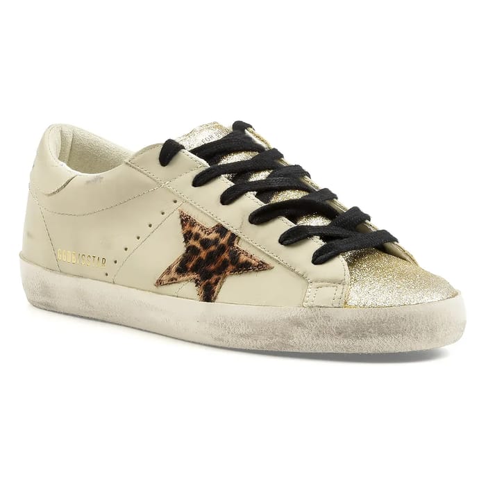 Les sneakers SUPER-STAR de la marque Golden Goose s'inscrivent dans la tendance actuelle de la mode avec un style affirmé et une touche d'élégance. Conçues pour être portées au quotidien, elles allient confort et polyvalence grâce à une tige en cuir ornée de paillettes, apportant une luminosité discrète et raffinée. Le dessus en cuir et paillettes, associé à une doublure en cuir et textile, assure une excellente respirabilité et un confort durable. La semelle intérieure amovible permet d’ajuster le confort selon les préférences personnelles, tandis que la semelle en gomme offre une stabilité solide pour les sorties quotidiennes ou les moments de loisirs. Un détail graphique en forme d'étoile sur le côté, avec un motif de léopard, met en valeur le design mode. Une inscription dorée "GGDB/STAR" est délicatement placée près du talon, ajoutant une touche signature. Disponibles en beige, ces baskets s’imposent comme un accessoire incontournable pour compléter une tenue moderne et élégante. -