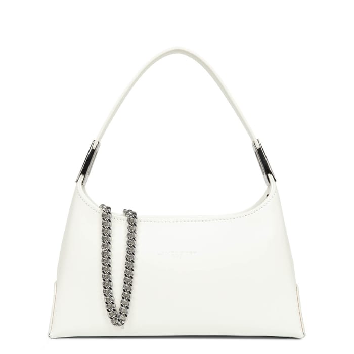 Sac à main SUAVE ACE de la marque Lancaster, conçu dans un style Besace pour une utilisation quotidienne. Ce sac est doté d'un dessus et d'une tige en cuir, offrant un aspect fonctionnel grâce à son ergonomie et à son confort. La doublure est en textile, ajoutant une touche de pratique à cette création polyvalente. Les dimensions sont 25 x 12 x 7 cm, ce qui en fait un accessoire idéal pour les occasions de tous les jours. La couleur est un blanc éclatant, qui se marie parfaitement avec les détails en cuir et en métal argenté. Le sac est conçu pour être porté main, avec un seul manche en cuir attaché à des fermoirs argentés de chaque côté. Un chaînette décorative est partiellement drapée sur la face avant du sac, ajoutant une touche de style. La conception est sobre et élégante, conviendra à diverses occasions. -