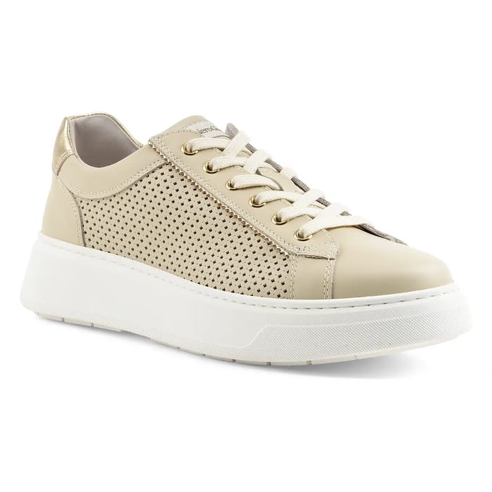 Les baskets Gonzaga de la marque Nero Giardini allient élégance et confort dans un design tendance et moderne. Fabriquées en cuir de qualité, elles offrent une tige structurée avec une finition texturée sur les côtés, des perforations discrètes pour une meilleure aération, et des lacets blancs passant par des œilletons dorés qui ajoutent une touche raffinée. La semelle en gomme épaisse et plate, de couleur crème légèrement plus claire que le dessus, assure une stabilité discrète tout en gardant un aspect fluide. L'intérieur en cuir amovible assure un confort optimal au quotidien, que ce soit pour marcher, faire des loisirs ou porter en tenue décontractée. Disponibles en couleur crème, ces baskets s'inscrivent dans la lignée du savoir-faire italien, alliant audace et sophistication. Un modèle polyvalent qui s'intègre facilement à toutes les tenues du quotidien. -