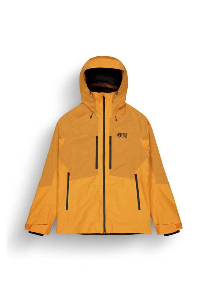 Veste de ski PICTURE M's GOODS JKT, style veste de ski, conçue pour les activités extérieures et les sports d'hiver. Cette veste est faite de 100% de polyester recyclé à partir de vêtements et de chutes de tissu, offrant une imperméabilité et une chaleur optimales. La veste est équipée de poches antérieures et postérieures avec fermetures à glissière noires, ainsi que de poches latérales avec fermetures à glissière noires et de poches de poignets ajustables avec bandes de Velcro. Le logo PICTURE est visible sur la poitrine gauche en lettres noires. La veste est disponible en orange, une couleur vif et attrayante qui conviendra parfaitement à vos sorties en plein air. Conçue pour offrir un confort optimal, cette veste est idéale pour les activités de ski, les randonnées en neige ou tout autre sport d'hiver. -