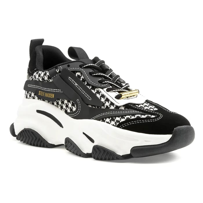 Les sneakers Possession-E de Steve Madden allient élégance et confort dans un modèle décontracté et léger. Confectionnées dans un mélange de textile, de synthétique et de cuir velours, elles offrent une allure moderne et intemporelle. Le dessus en matière texturée met en valeur un motif à carreaux noirs et blancs, tandis que les lacets noirs et la finition or métallique près des œuvres renforcent leur touche distinctive. La semelle intérieure amovible en textile assure un confort optimal, idéal pour les sorties ou les activités en plein air. La semelle extérieure en synthétique, robuste et structurée, apporte une stabilité discrète sans compromettre le style. En noir uni avec des surpiqûres noires autour du bout et du talon, ces baskets s’adaptent parfaitement à une tenue décontractée ou une sortie estivale. L'ensemble dégage une esthétique épurée, avec une touche de brillance grâce au branding jaune vif sur le côté. Ces baskets allient respirabilité, confort et design affirmé pour une expérience quotidienne agréable. -