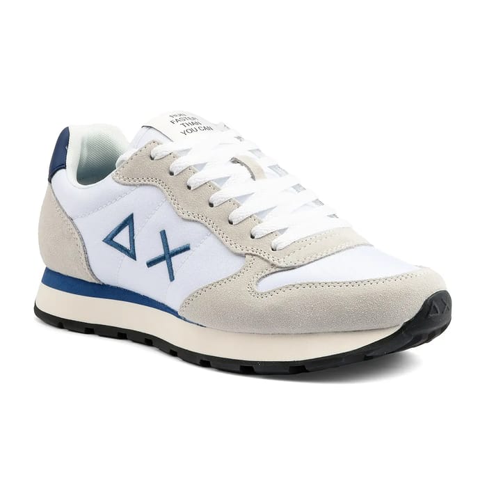 TOM SOLID, une paire de sneakers de la marque Sun 68, est une proposition tendance et mode pour les amateurs de style. Cette paire de sneakers est conçue pour les jours de marche, de loisirs ou de tous les jours, avec un design polyvalent qui conviendra à tous les goûts. La paire TOM SOLID se caractérise par un dessus et une tige en daim textile, offrant un confort optimal. La doublure est également en textile, ajoutant une touche de légèreté et de souplesse. La semelle intérieure est amovible et en textile, facilitant ainsi le nettoyage et la maintenance. La semelle extérieure est en synthétique, offrant une résistance et une durabilité exceptionnelles. Le talon mesure 25 mm, ce qui garantit une prise solide et une stabilité lors de la marche. La paire TOM SOLID se distingue par son design unique, qui combine le cuir velours et le textile. La couleur principale est le blanc, avec des accents en beige pour les panneaux latéraux et le talon. Des accents bleus sont également présents, notamment un logo triangulaire près des lacets et un petit "AX" en bleu foncé sur le côté latéral du talon. Des détails en bleu marine sont également présents autour de la collerette et de la languette, où l'on peut lire "courir plus vite que tu ne peux". La paire TOM SOLID est une proposition mode et tendance qui répond aux attentes des amateurs de style et de confort. -