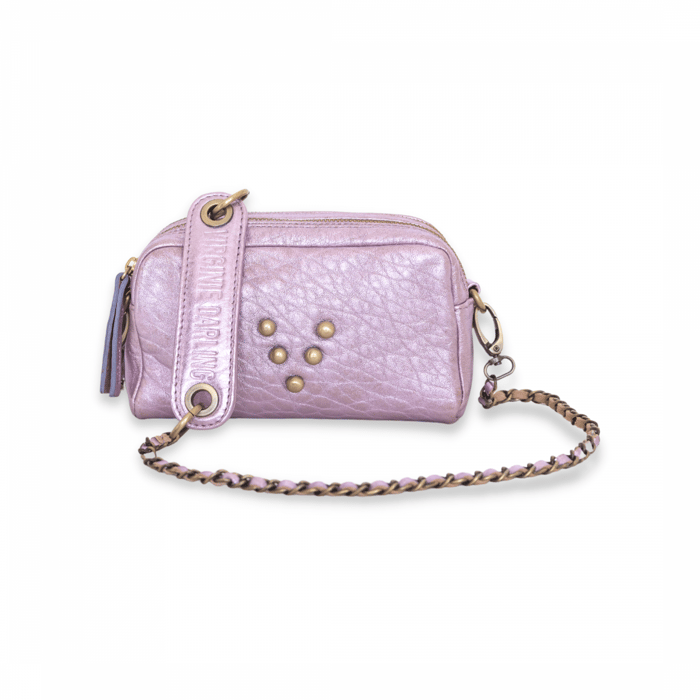 Sac à bandoulière MAKE-ME-UP SMALL de la marque Virginie Darling, conçue pour les sorties, le bureau et les voyages. Cette pochette chic et moderne est faite de cuir rose, avec une doublure en tissu. Elle dispose d'un système de bandoulière en cuir avec une chaîne détachable et des anneaux en métal, offrant une grande flexibilité. Le sac est équipé d'une fermeture à glissière métallique et de deux tassels décoratifs. La pochette est également dotée d'un emboitage en cuir avec le nom de la marque, "LIZETTE PARINI", et de quatre étuis en métal disposés en forme de diamant sur le devant. Avec son style moderne et ses détails soignés, la pochette MAKE-ME-UP SMALL est parfaite pour les occasions quotidiennes ou pour les sorties spéciales. -