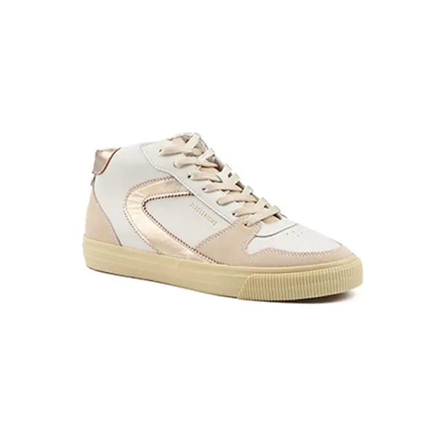 The Jade WHT High Top Sneakers offer a mix of style and functionality. Designed for urban fashion lovers, these shoes combine a leather and suede upper and upper with a sponge lining for a comfortable feel. The leather insole is removable, making it easy to maintain shoes. Synthetic soles ensure durability and wear resistance. Details of the shoe include an uphill leather and velvet leather sneaker, adding an elegant touch to its design. The flat laces in beige surround with metal, while the golden metallic details on the sides add a touch of sophistication. The main color is white, with accents in beige and golden touches. The Jade WHT sneakers are ideal for everyday occasions, fashion and half-season activities. -