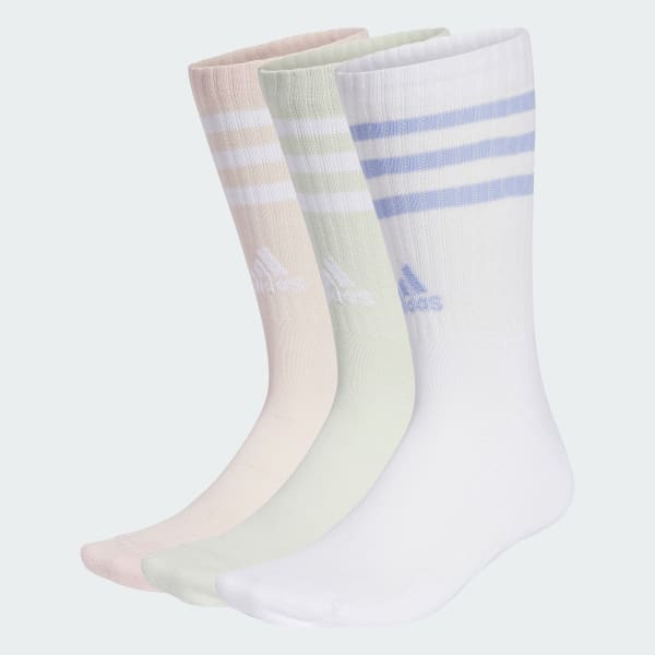 Discover the Adidas 3S C SPW CRW 3P multisport socks, ideal for your leisure, training and various sports. These leisure socks are designed to accompany you in all your sports activities, with a mix of 62% cotton, 36% recycled polyester, 1% elastane and 1% recycled polyamide. Their upper is soft and breathable, allowing you to feel comfortable throughout your activities. The three socks in this pair are colorful and decorated with horizontal or vertical stripes, depending on the colors, for a touch of style and personality. The first sock is pale pink with two white stripes near the top, the second is green with similar green stripes, and the third is white with horizontal blue stripes. All three have the Adidas trefoil logo on their side. The Adidas 3S C SPW CRW 3P socks are perfect for sports enthusiasts, athletes and people who love to spend time outdoors. They are designed to be versatile, to maintain their shape throughout your activities and to offer you optimal comfort. -