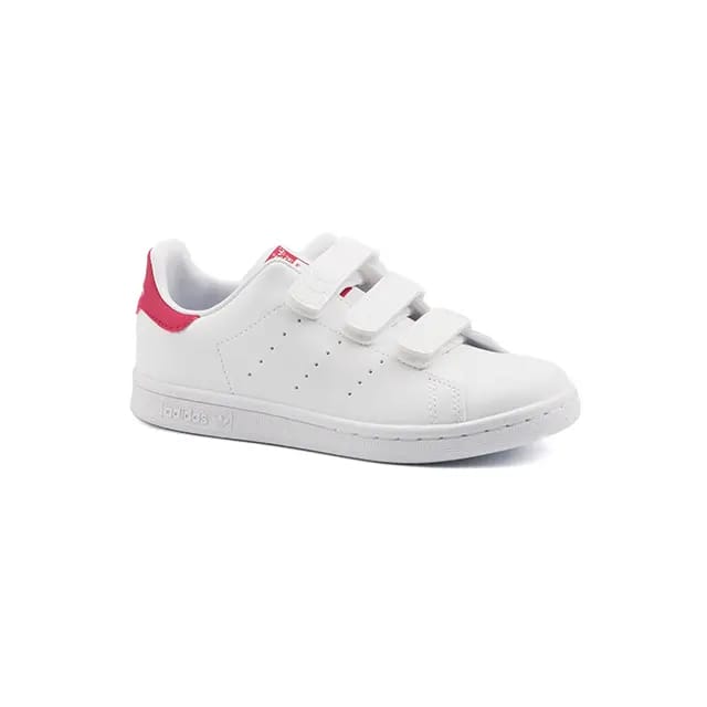 The Stan Smith Adidas are Velcro shoes designed for everyday use, practical and casual. These sneakers are perfect for leisure and easy mobility. Their top and upper are made of synthetic, while the lining is made of textile and synthetic. The insole is also textile and removable. The sole is made of rubber. Details of these shoes include a synthetic sneaker and an embossed adidas emblem near the heel. The Stan Smith shoes are available in white, with a red accent on the heel. They are designed for kids or toddlers due to their small size and easy-to-use locking system. -