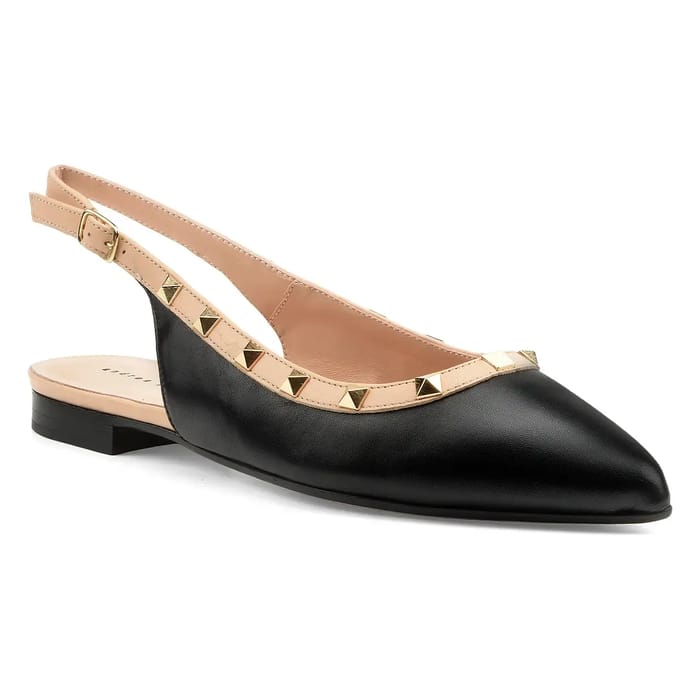 These Andrea Puccini Imperiale pumps combine timeless elegance with bold details for a decidedly feminine style. Designed in a carefully selected leather and embellished with pyramidal golden studs along the stem, they embody French-style refinement. Their slingback design, marked by an adjustable strap and a discreet buckle, perfectly fits the silhouette while bringing a touch of sophistication. The leather insole and 10 mm heel guarantee optimal comfort, ideal for evenings, events or office days. The leather lining and leather outsole enhance the durability and luxury of the model. Available in black, this pair fits as well in a classic outfit as with more contemporary pieces, reflecting the trendy and timeless spirit of the brand Andrea Puccini. Made with passion in Spain and Italy, these pumps are the perfect balance between artisan and modern, for an assumed and refined femininity. -