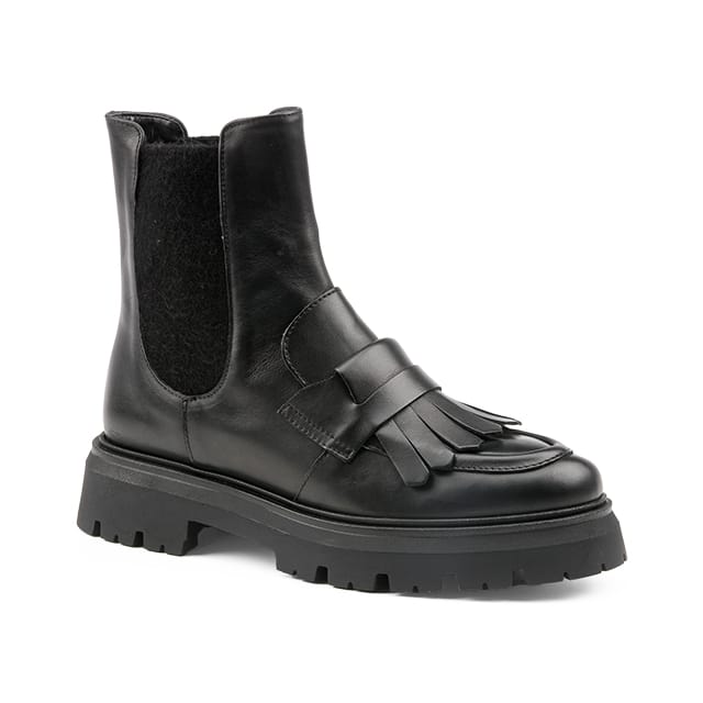 The chelsea Monia ankle boots by Andrea Puccini are a perfect choice for women who enjoy a chic and timeless style. Made with the utmost care in Spain and Italy from selected leathers, these ankle boots feature a stylish design and stitching details that make them ultra-feminine. The leather used for the lining and insole ensures optimal comfort, while the synthetic outsole offers exceptional durability. The Monia ankle boots are available in black, a classic color that suits every occasion. They are ideal for women who want an elegant look for evenings, but also for office days or for daily outings. The Chelsea style, combined with the ease of donning thanks to the elasticity of the side part, makes it a convenient and pleasant choice to wear. The details of these ankle boots are carefully designed to offer a unique and trendy look. The front part is adorned with fringe details that add a touch of sophistication, while the thick, lugged sole ensures optimal stability and safety. Andrea Puccini's Monia ankle boots are a smart choice for women looking for chic style, optimal comfort and exceptional quality. -