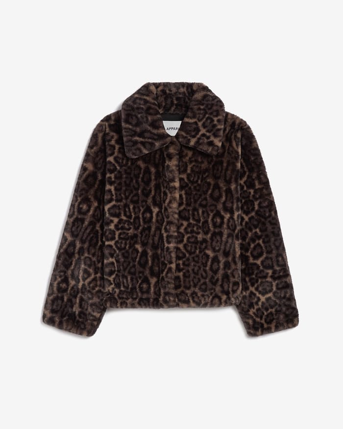 The W's Elise Leopard short coat from the brand Apparis combines elegance and practicality in a design that is both casual and chic. This faux fur jacket adorned with a leopard pattern with shades of brown and black is part of a range of outfits suitable for the day as well as for outings. Its lining made of 50% recycled polyester and 50% polyester ensures optimal comfort while responding to an eco-responsible approach. Featuring a high collar, it offers enhanced protection against cold low temperatures, while highlighting an assertive style. Ideal for work or outings, this piece combines functionality and aesthetics with a distinct allure. -