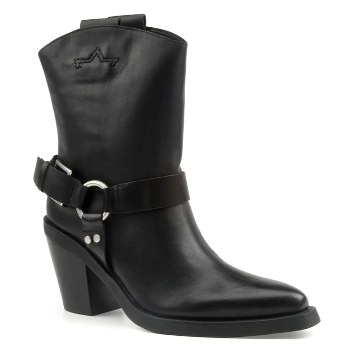 The Ash LOGAN city ankle boots are designed for everyday use, while offering an elegant style. Made of leather, these ankle boots feature a leather upper and lining, ensuring superior quality and durability. The leather insole ensures optimal comfort, while the synthetic outsole provides solid protection. The heel measures 60 mm, offering an ideal height for an elegant look. The LOGAN ankle boots combine the classic elements of the western ankle boots with modern fashion sensitivities, creating a unique and attractive style. The black color is a perfect option for a casual and elegant look. The adjustable strap with a silver buckle around the heel allows for an easy fit for optimal comfort. A small decorative emblem is stitched near the top of the leg on the outside side, adding a personal touch to these Ash LOGAN city ankle boots. -