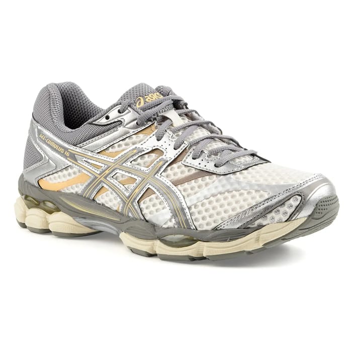 The GEL-CUMULUS 16, designed by Asics, are versatile sports shoes designed for everyday activities, walking and leisure. These textile and synthetic sneakers feature a white top with grey and gold accents. Their design includes mesh materials for better ventilation, synthetic overimpregnations for better stability and the Asics brand logo prominently displayed on the silver and gold metal side. The gray laces pass through fabric eyelets and additional cushioning elements are visible around the heel area. The textile and removable insoles offer a comfortable lining. The synthetic soles ensure optimal durability and performance. The GEL-CUMULUS 16 are available in a range of multi-colored colors, making them perfect for fashion and trend lovers. -