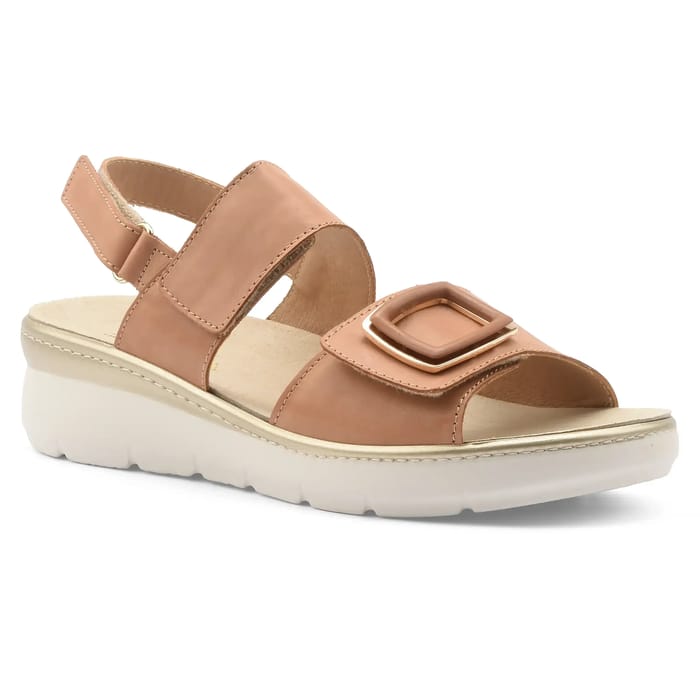 These Atema 12564 flat sandals combine elegance and comfort for uncompromising summer days. Designed in soft and durable leather, they perfectly fit the shape of the foot while offering optimal breathability thanks to their lightweight synthetic lining. The removable leather insole, combined with a 45 mm synthetic outsole, ensures soft support and increased stability, ideal for everyday use, on vacation or at the beach. The casual and timeless cognac-tinted design seduces with its stylish details: an adjustable strap at the forefoot, adorned with an elegant square pattern, and a second wraparound strap around the ankle, both made of smooth leather for a pleasant touch. The lightweight construction makes it an ally for long days, while their versatile appearance makes them perfect for effortlessly switching from relaxing on the sand to a city walk. Perfectly suited for summer wear, these sandals embody the balance between practicality and style, for a foot that is both protected and free. -