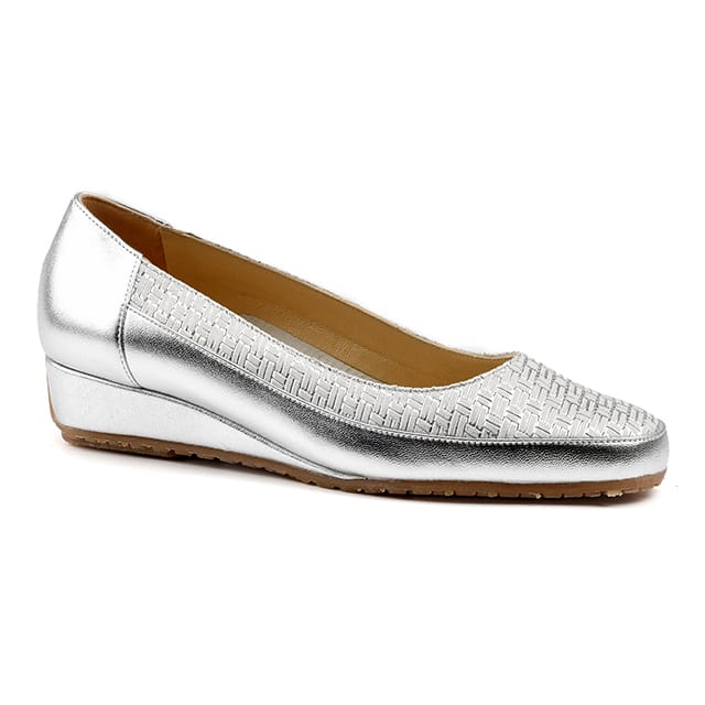 Bagnoli 6060, a pair of casual and chic flats, ideal for everyday, work or casual outings. This pair of shoes is made of metallic leather for the top and upper, and leather for the lining and insole. The outsole is made of rubber. The heel measures 25 mm and is compensated for optimal comfort. The pair of flats Bagnoli 6060 is available in silver and is characterized by a touch of style with a woven pattern on the heel area and a smooth upper section. -